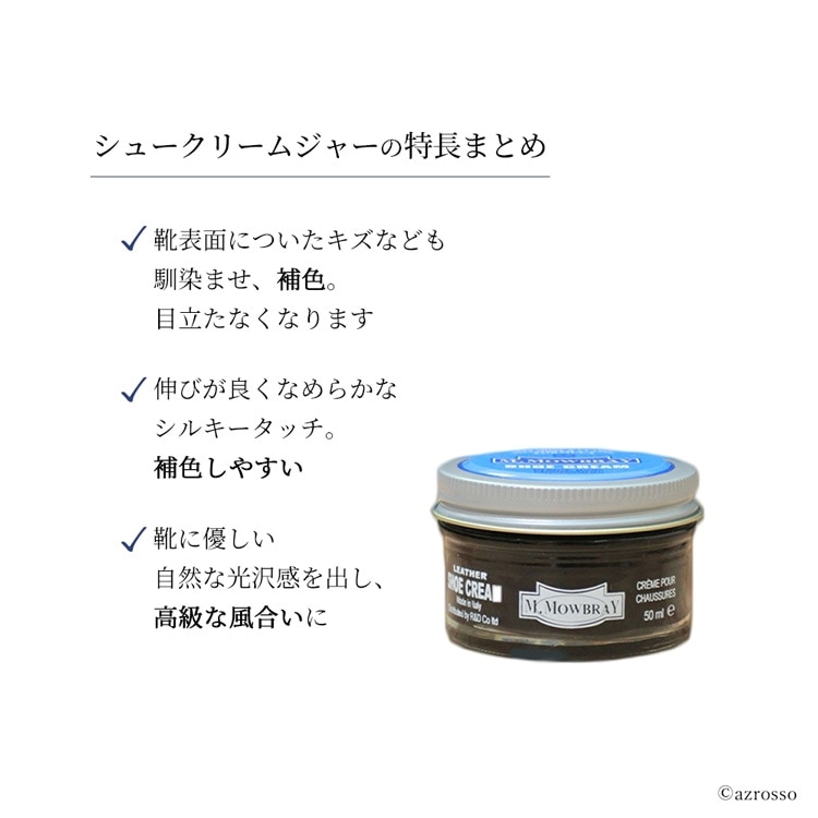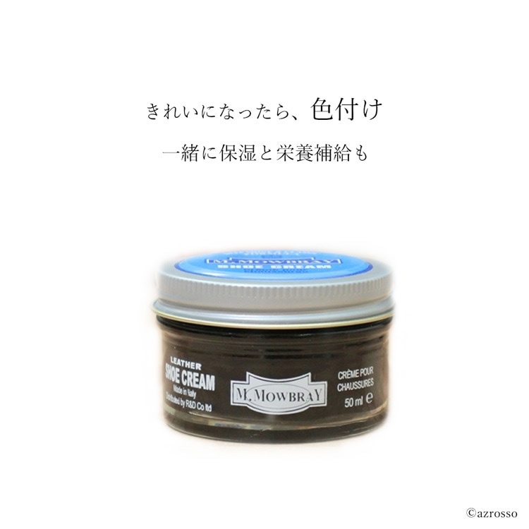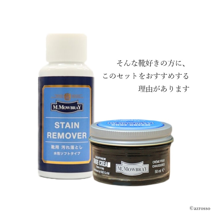 | パンプスやローファーなどのレザーシューズ、ブランド品など、大切な革靴のお手入れ用品をお探しの方に。 M.モゥブレィ(M.MOWBRAY)より、靴の汚れを落とすステインリムーバーと、靴クリームのシュークリームジャーのお手入れセットをご紹介。 ステインリムーバーは、革靴のお手入れ初心者でも簡単にお使いいただける汚れ落としです。 高いクレンジング力で、皮革の表面についた落ちにくい油汚れや汗の成分、頑固な汚れや古いクリームをキレイにします。 軟水をベースに作られた仕様で、汚れ落ちは抜群ながら色落ちやシミのリスクを軽減。 大切な靴にも安心してお使いいただけるクリーナーです。 皮革表面を撫でるように拭くだけで汚れが落ちるので、シューケア初心者でもお手入れ簡単。 シュークリームは伸びが良く抜群の光沢感を得ることができます。 高い浸透力で革靴に栄養と潤い、柔軟性を与え、補色力も抜群。靴を長持ちさせる革靴お手入れ用クリームです。 靴の艶出しや防水、補色、栄養補給に。 ブラック ニュートラル ダークブラウン ミディアムブラウン ライトブラウン コニャック ロンドンタン ベージュ バーガンディ レッド グリーン ネイビーブルー グレー ホワイトの14色。 |