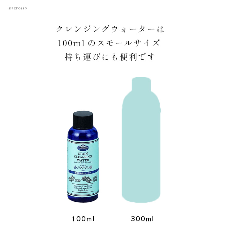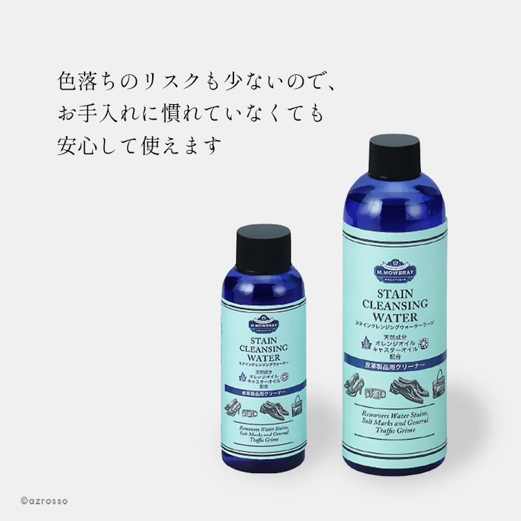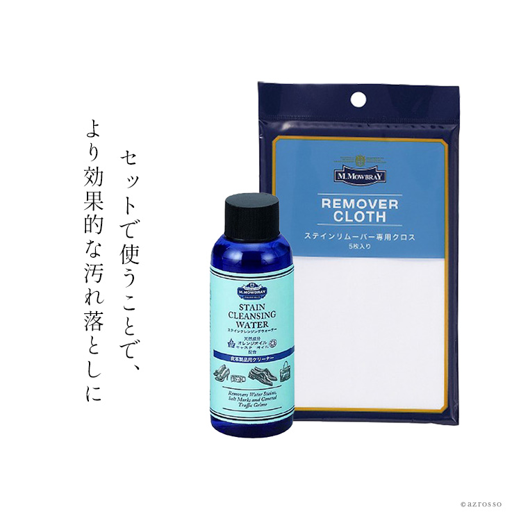 | ヨーロッパで人気のお手入れブランド、M.モゥブレィ(M.MOWBRAY)の、革靴のための究極の汚れ落しと艶出しケアの2点セット。 (1)ステインクレンジングウォーター オリーブオイルやホホバオイルなどの天然素材を配合した革にやさしい汚れ落とし。有機溶剤不使用だから色落ちリスクも少なく、お手入れに慣れていない方でも安心してお使いいただけます。 数滴を布に取り、なでる様に靴を拭くだけで簡単に土やホコリ、水染み、油などを落とすことができるんです。 使い方はシンプル。 (1)ふたを閉めた状態で5〜6回ボトルを振り、良く混ざった状態で使います。 (2)別売りのリムーバークロスを指に巻き付け、指先が湿るくらい本品をとります。 (3)なでる様に汚れを拭き取ります。布の面が汚れたら、綺麗な面に変え、繰り返します。 ※片足あたり靴全体を3~5回ほど拭き取ると、「汚れ」「古いクリーム」をしっかり落とせます。 ※吹いた直後は、一瞬革の色が濃くなりますが、数秒放置すれば元の状態に戻ります。 革靴だけではなく、スニーカーのソールや革底にも使用できます。 (2)汚れ落としための専用クロス。 ツヤだし用のクロスとは違い、粗目のつくりで、軽く表面を撫でるだけでも汚れをしっかり除去。 100%国産の綿を使用。 水や中性洗剤でクリーニングも可能です。 この2点セットで使うことで、効果的な革靴のケアが簡単に実現します。 |