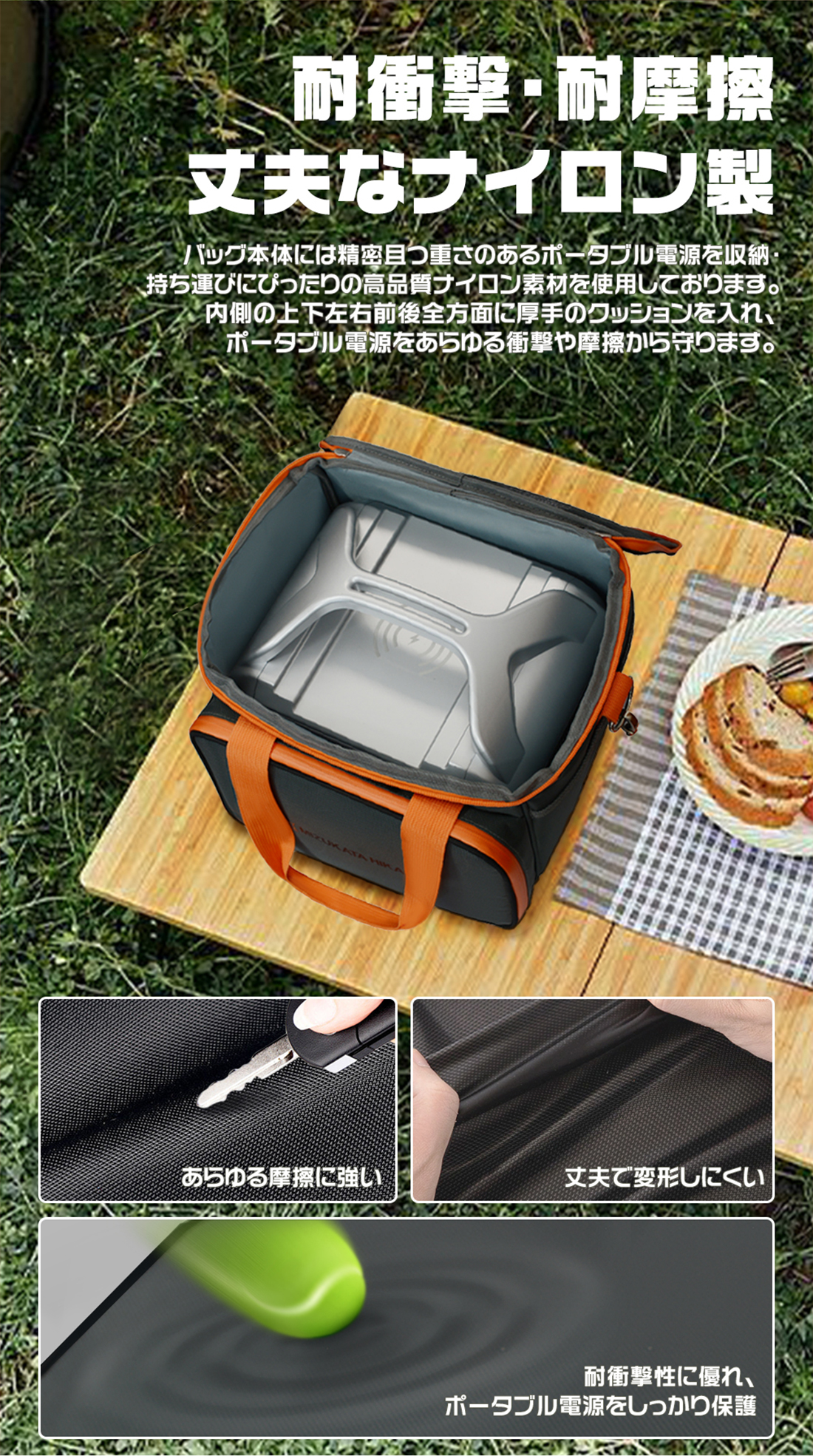 【耐衝撃・耐摩擦・丈夫なナイロン製】バッグ本体には精密且つ重さのあるポータブル電源を収納・持ち運びにぴったりの高品質ナイロン素材を使用しております。さらに、内側の上下左右前後全方面に厚手のクッションを入れ、ポータブル電源をあらゆる衝撃や摩擦から守ります。