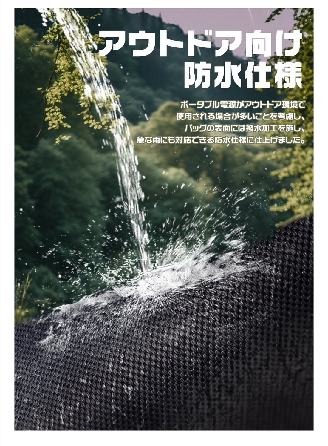 【アウトドア向け防水仕様】ポータブル電源がアウトドア環境で使用される場合が多いことを考慮し、バッグの表面には撥水加工を施し、急な雨にも対応できる防水仕様に仕上げました。
