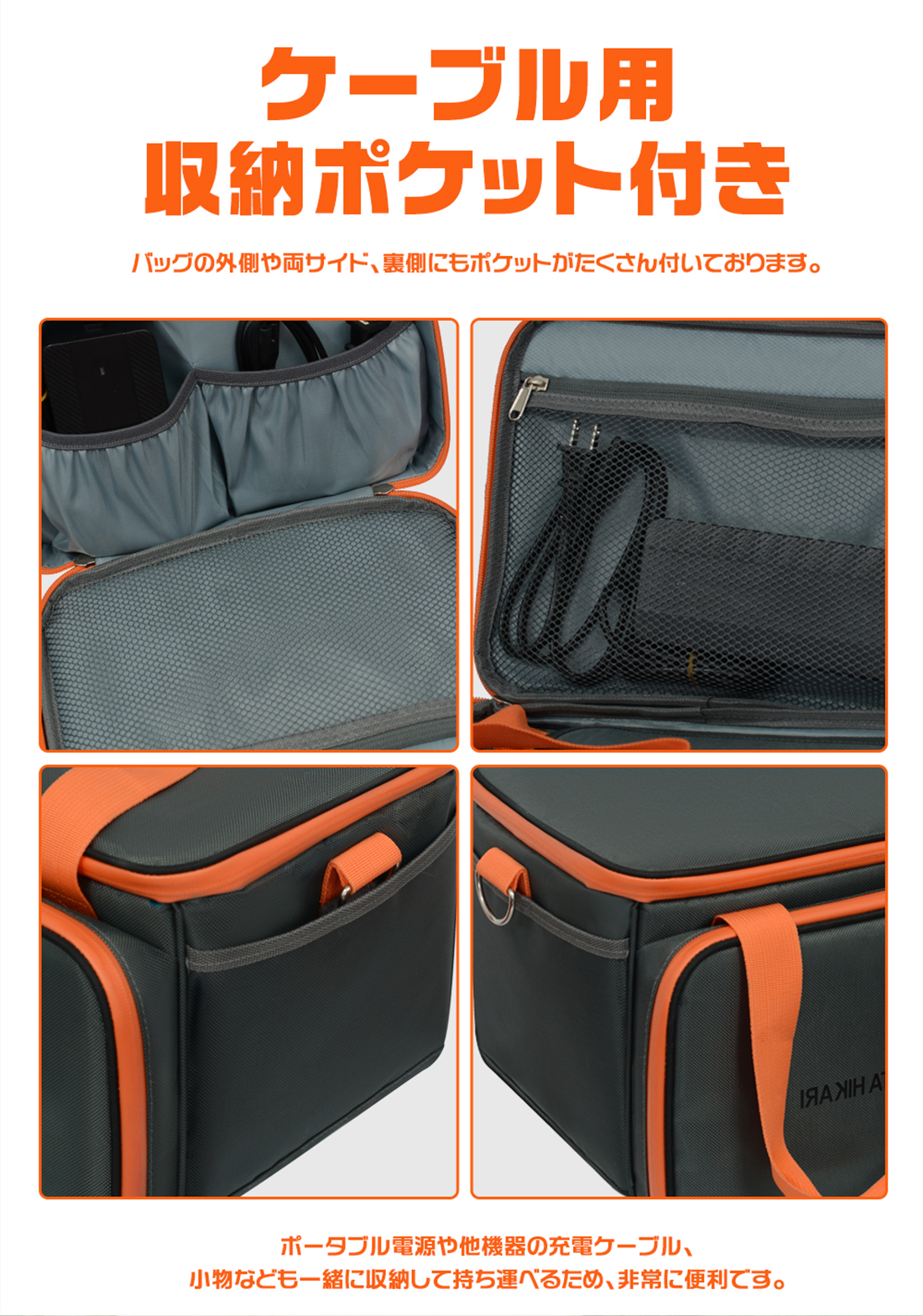 【ケーブル用収納ポケット付き】バッグの外側や両サイド、裏側にもポケットがたくさん付いており、ポータブル電源や他機器の充電ケーブル、小物なども一緒に収納して持ち運べるため、非常に便利です。