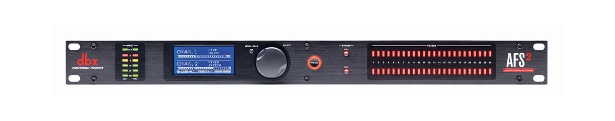 ハウリングの検知やノッチフィルターの制御には「AFS」アルゴリズムの最新版を採用。dbx の従来モデルより周波数分解能が向上し、ハウリング検知の速度と精度がアップ。ハウリングに似た音源(フルートやキーボード等)に対する誤検出が大幅に低減。