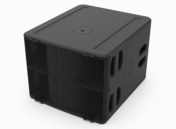 L15は、幅550mm × 高さ439mm × 奥行650mm、重さ35kgのサブウーファーです。バーチ材とポプラ材を組合せた特注プライウッドの筐体内に15インチロングエクスカーションドライバーを搭載し、天面にポールマウント用のネジ穴(M20)を、また両側面にもリギングアクセサリー用のネジ穴を装備しています。40〜120Hzの再生周波数特性、139dB SPL peak@1mの最大音圧レベルという優れたスペックを持つL15は、P12にマッチするフットプリント(設置面積)を考慮してキャビネットが設計されており、P12とのフライング、もしくはドラムフィル(L15の上にP12をウェッジモードで直接スタック)での使用にも最適です。