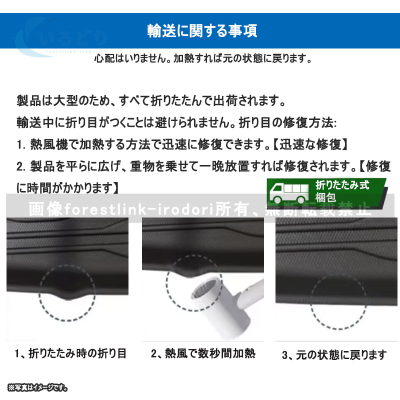 ※発送サイズ規定の関係により商品を丸めた状態で発送いたします。商品到着後は折り目が残る場合もございますが、弾力性の高い素材ですので時間がたてば元の形状に戻ります。