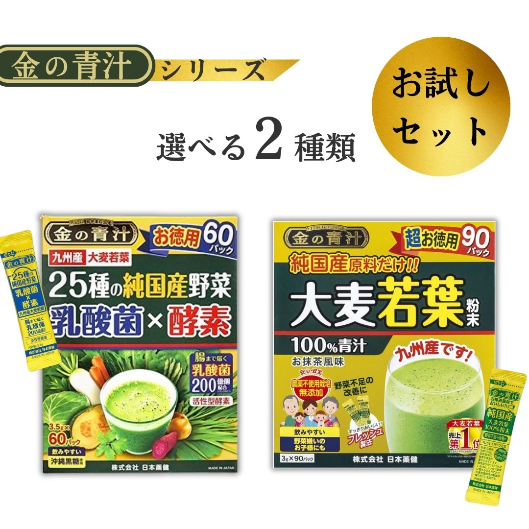 内容量 | 1)金の青汁 25種の純国産野菜 乳酸菌 酵素 20包 お試し:3.5g×20包 2)金の青汁 純国産大麦若葉 100% 30包 お試し:3g×30包 |