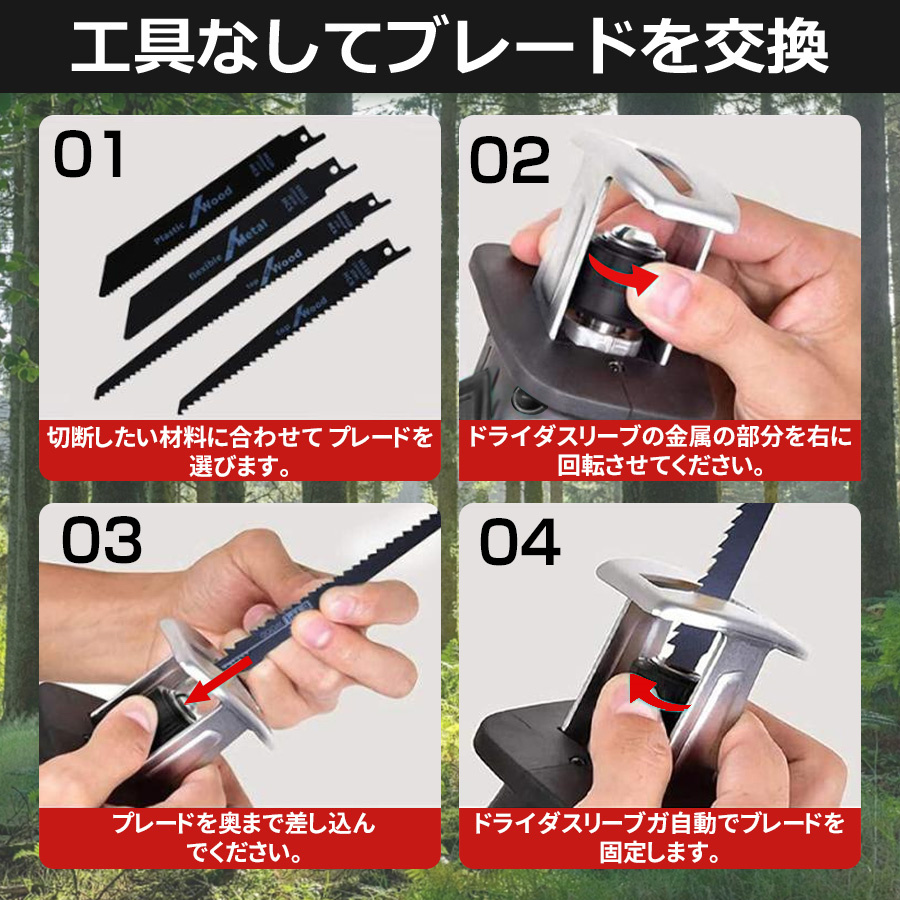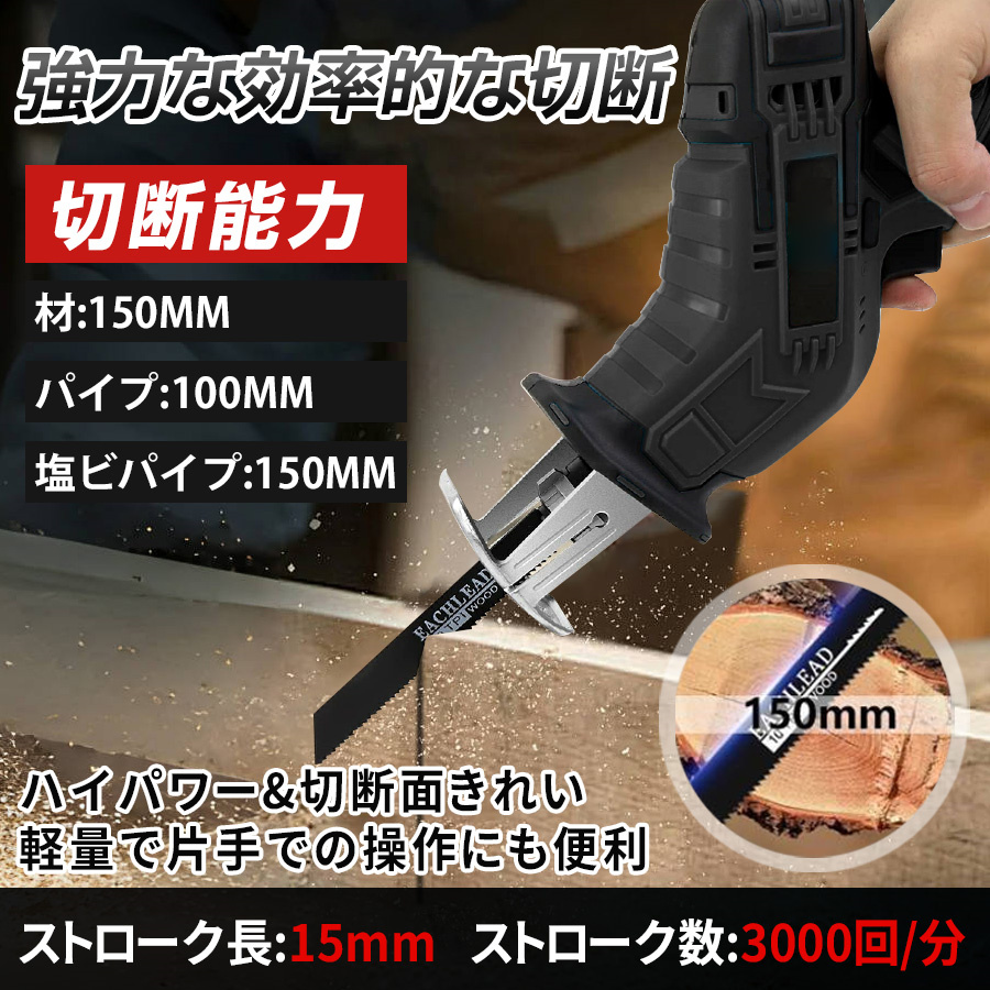 【4本替刃が持つ】マキタの18Vリチウムイオンバッテリーを使用して、高速で切断することが可能です!木材/15cm 塩ビパイプ/15cm 軟鉄パイプ/10cm軟鉄材/3mm厚。3000min-1高速ストローク&無段変速機構、高速ストローク、従来品と比較して切断スピードが約20%アップできます。
