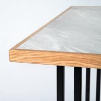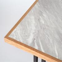 ナチュラルの天板にはライトグレーの石目調シートを貼っており、天板の表面は傷や汚れに強いメラミン化粧繊維板を採用しています。