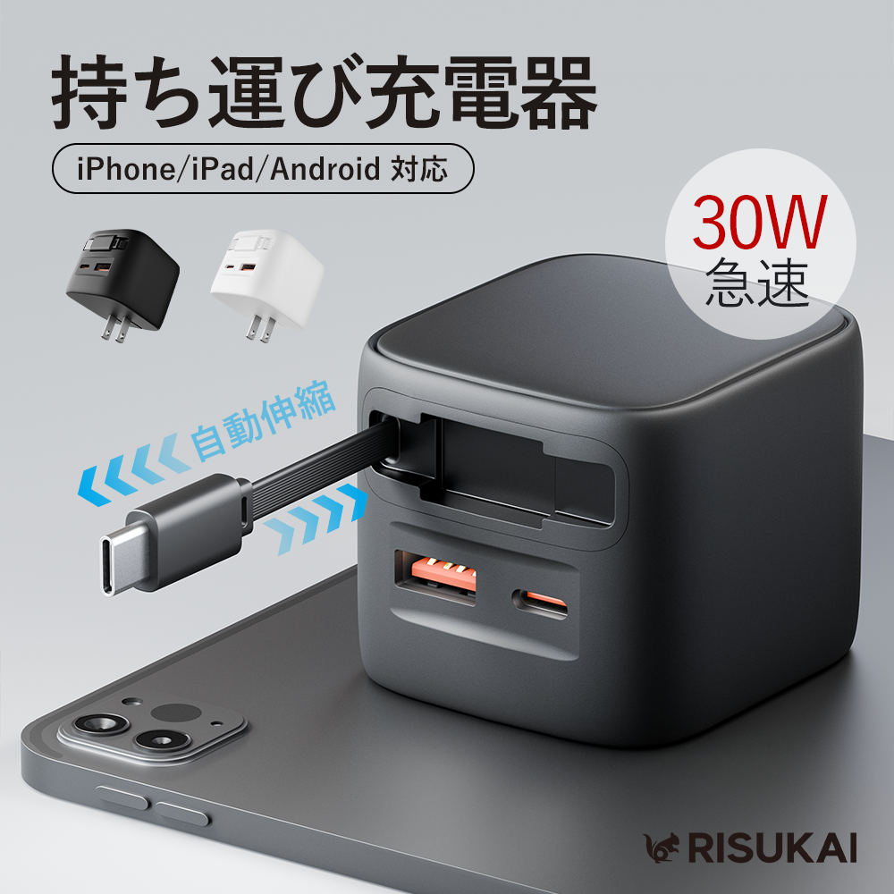 リスカイ★伸縮式充電ケーブル★ Type-C充電ケーブル付き携帯電話充電器 iPhone対応 PD 30W急速充電 USBインターフェース 伸縮式 Lightningケーブル デュアルポートアダプター データケーブル 折りたたみ式プラグ 持ち運び便利&スッキリ収納!