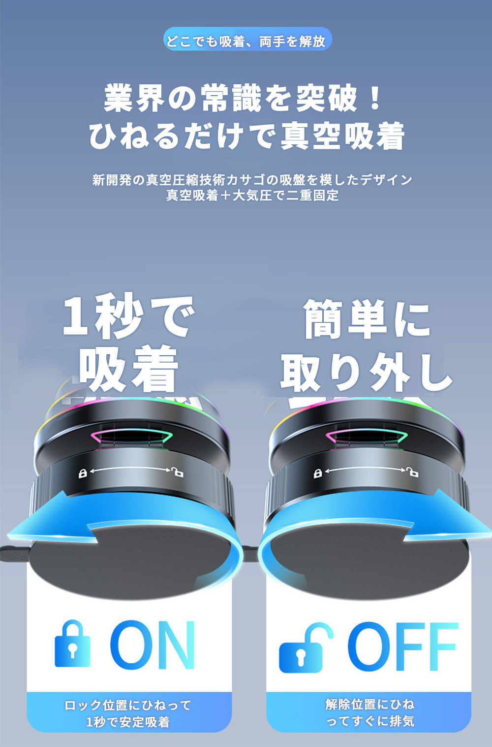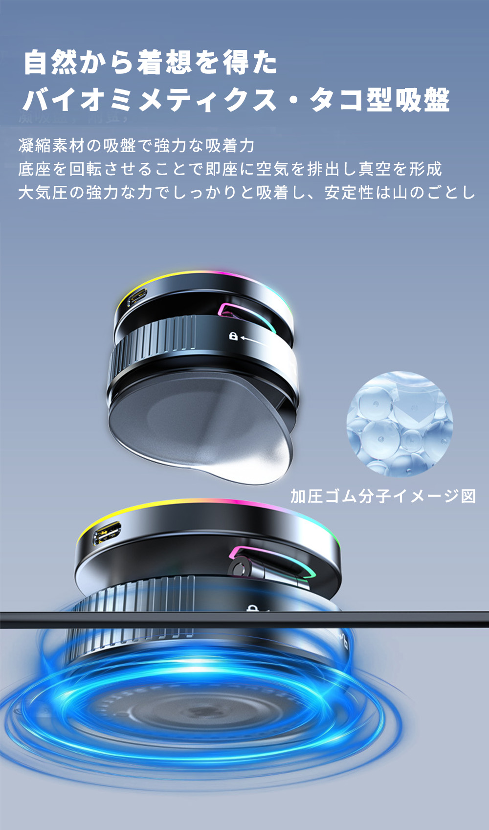 【究極の安定性】ナノゲルが強力吸着し、真空吸盤が空気を逃さず密着。
