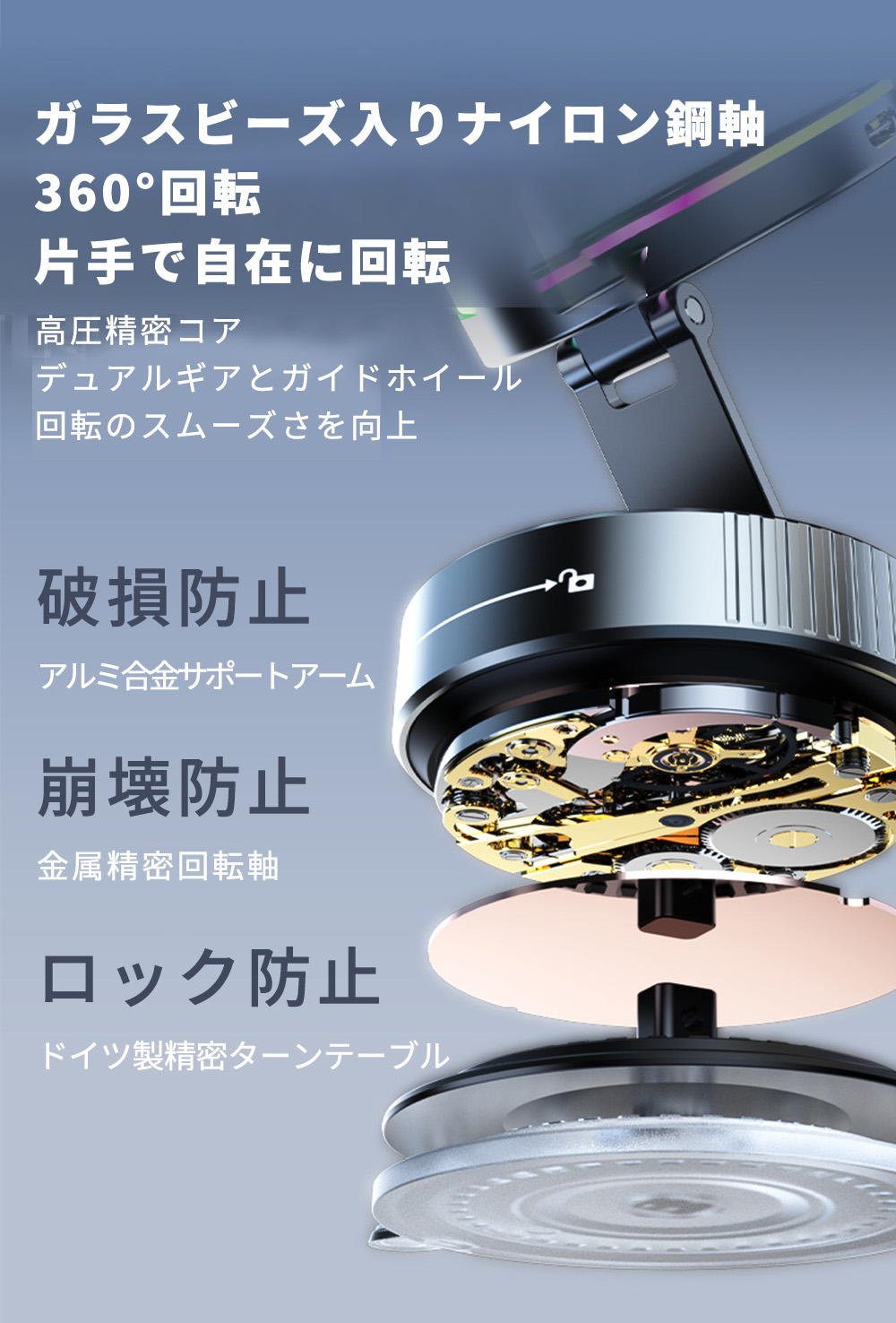 【360°回転&片手操作】W軸構造により縦横・上下左右の角度調整が自由自在。