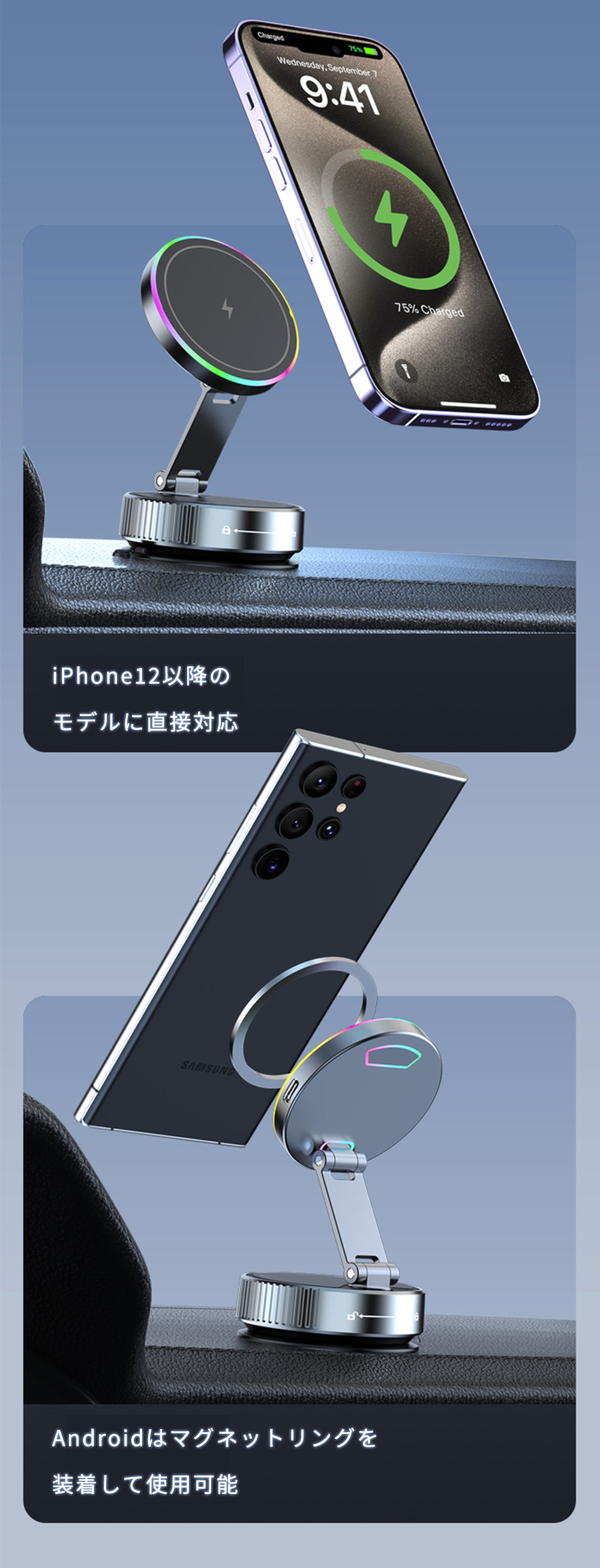 厚めのケースを付けたままでも使用可能。軽自動車からSUV、トラックまで設置でき、スマホや車種を選びません。