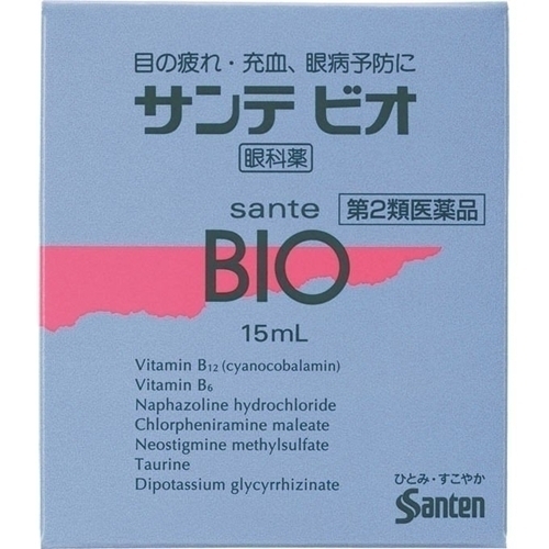サンテビオは、遠近調節を行う目の筋肉(毛様体筋)のはたらきを活発にするビタミンB12(シアノコバラミン)、ピント調節機能改善作用のあるネオスチグミンメチル硫酸塩や目の炎症を抑えるクロルフェニラミンマレイン酸塩など7つの有効成分をバランス良く配合し、目の疲れ・充血を改善する目薬です。