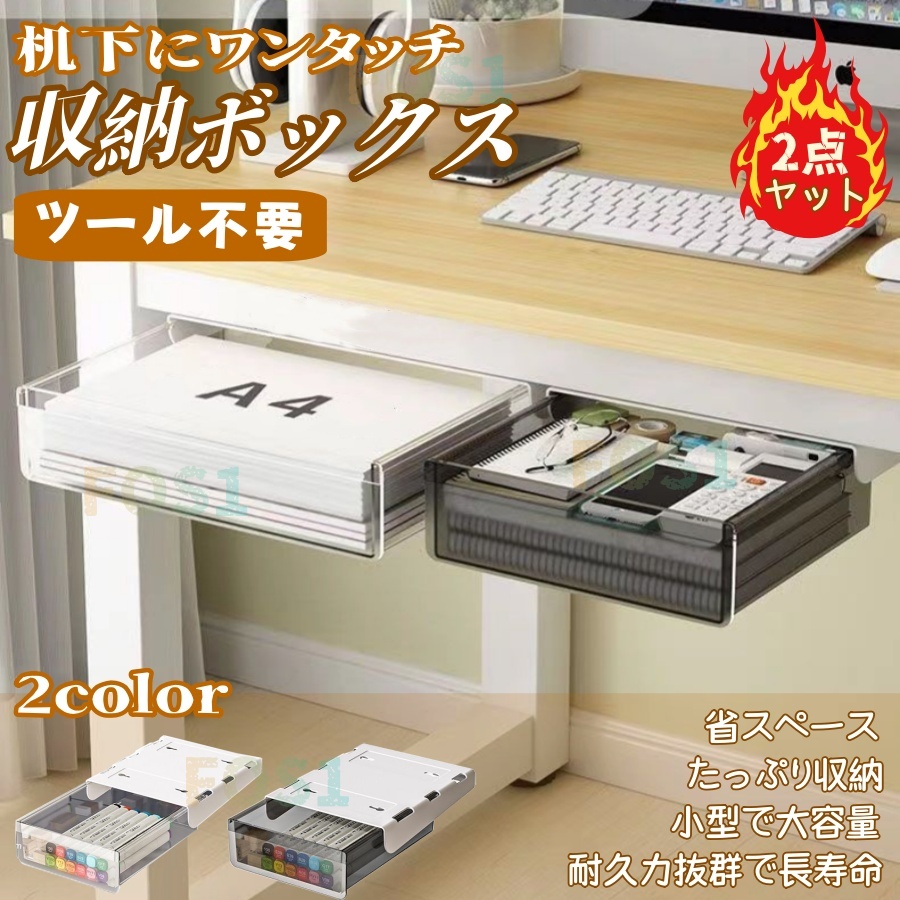【2個セット】デスク下 引き出し 収納ケース 収納ボックス テーブル デスク 文房具 取り付け式 便利 机下収納 小物整理 透明 トレイ 文房具 事務用品