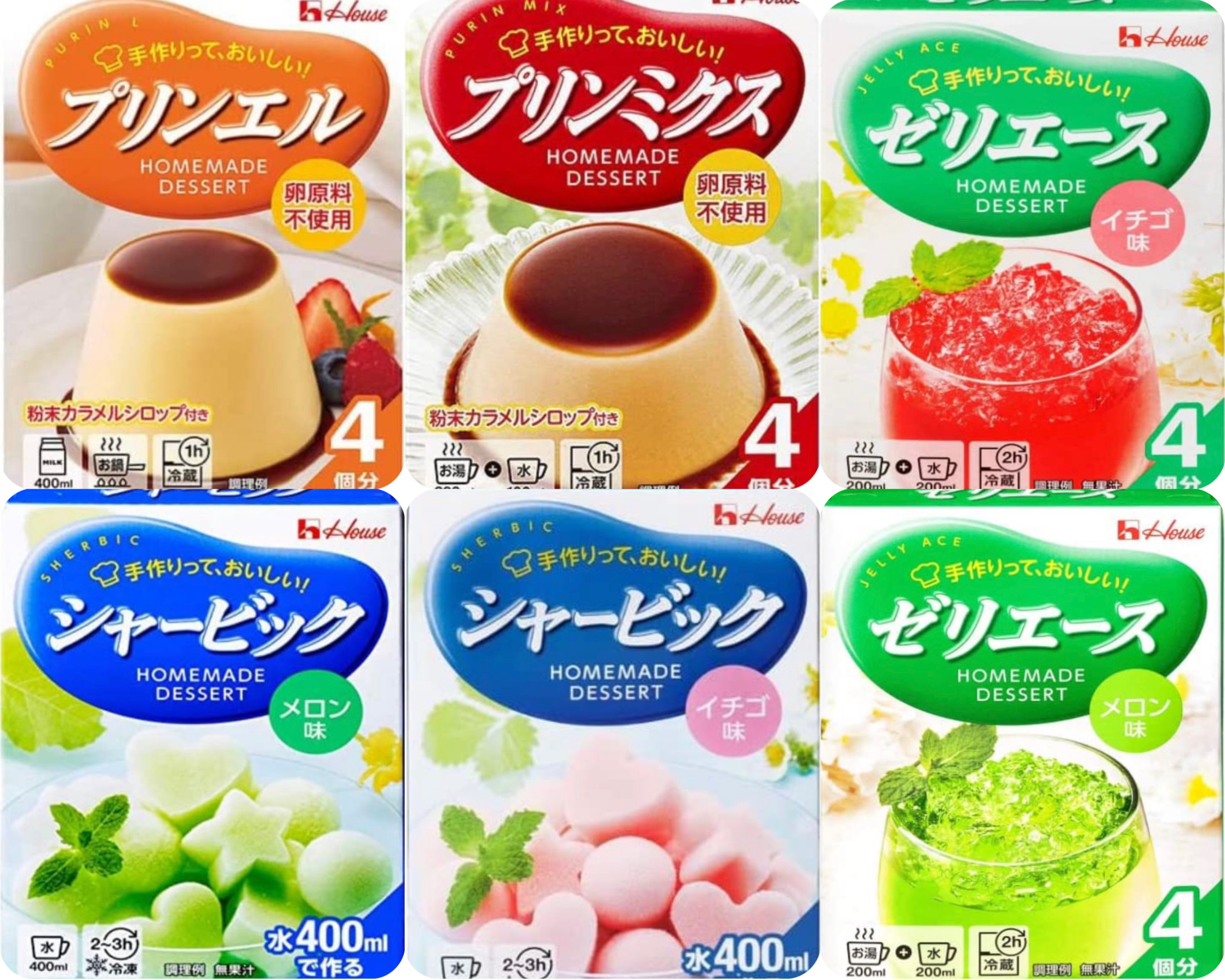 ハウス ホームメイドデザート6セットプリンエル/プリンミクス/ゼリエース イチゴ味/メロン味/シャービック メロン味/イチゴ味