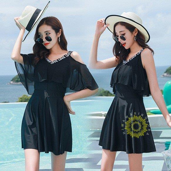 水着レディース 体型カバー 水着 ワンピース型 セパレート 肩出し 小胸バンドゥ 水着2点セット 黒 フリル 韓国風 40代 大きいサイズ 可愛い ウェア 温泉 ママ