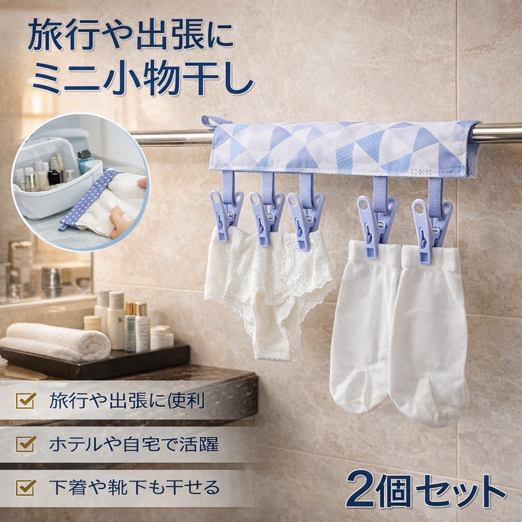・下着や靴下等の乾燥に最適な旅行小物 スペースのない小さな部屋やホテルでも、ハンガーや浴室内を利用して、簡単に乾かすことが出来ます。旅行や出張で荷物になりがちな下着、靴下、タオルなどをさっと洗って乾燥できますので、持っていく荷物が少なくなります。