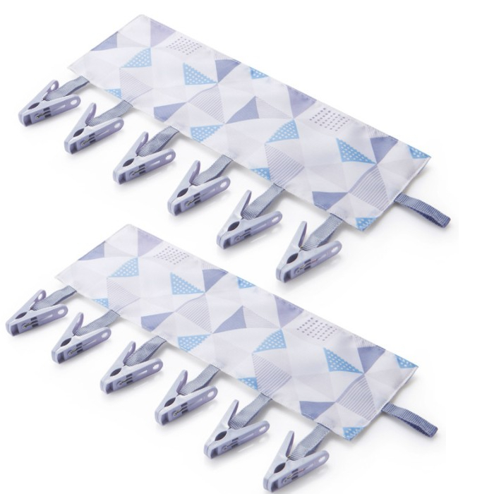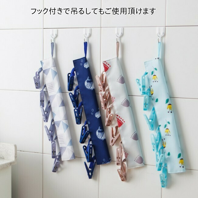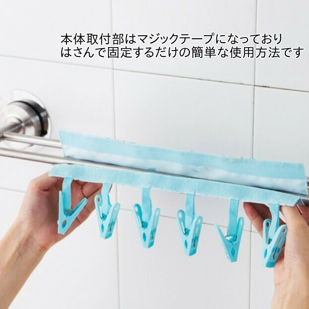 ・ご利用方法 本体裏側の上下両方にマジックテープが付いています。ハンガー、タオル掛け、物干し竿、ロープなどに巻き付けて固定することで、付いている6つのピンチに洗濯物を干すことが出来ます。また片側には引っ掛けられるフック紐がついてるので、縦にもご使用頂けます。
