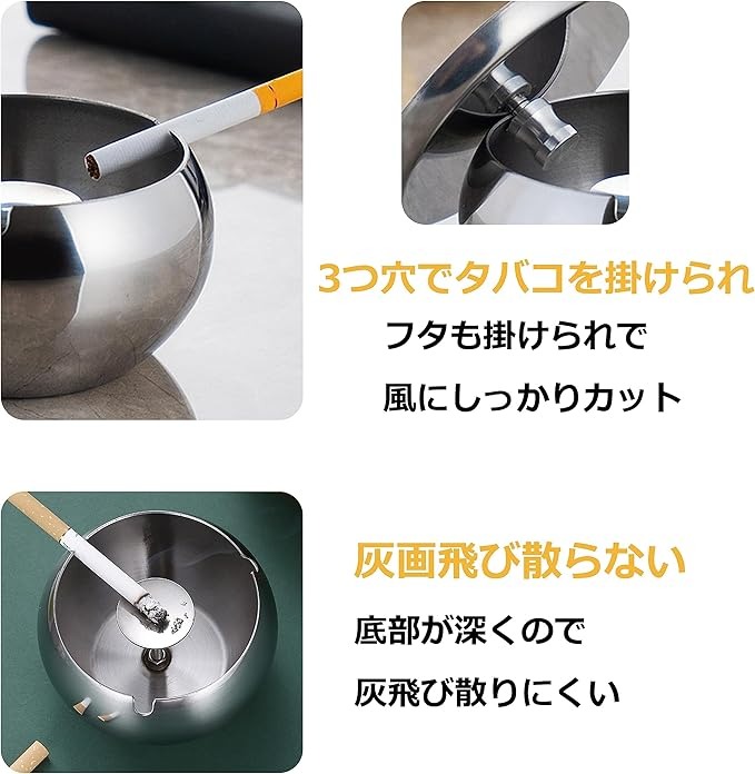 ・蓋付きなのでタバコの臭い漏れを防ぎ、灰の飛び散りや吸い殻が見えてしまうことを防止できます。開口部に三つの「U型タバコ休め」のデザインがあり、灰を落としやすく、複数人の利用にも便利です。