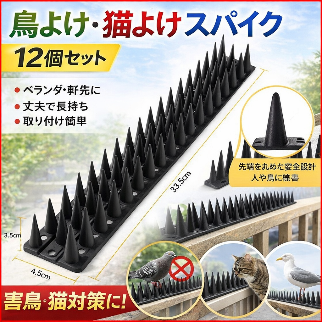 ・猫の侵入防止にも役立ちます。雨風雪などの過酷な環境でも耐久性があり長く使える設計です。取り付け工事不要で初心者でも手軽に設置できる防鳥用品です。鳥のフン害や猫による被害を減らしたい方におすすめの害鳥猫よけグッズです。
