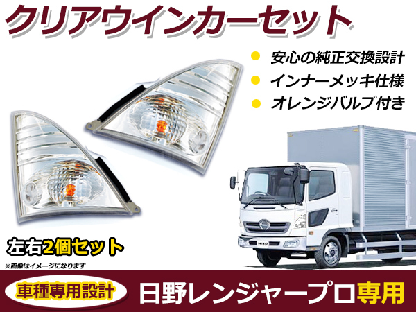 | 【商品説明】 日野 NEWプロフィア/レンジャープロ専用サイドクリアウィンカーセット 純正のサイドウィンカーをクリアタイプに!! 専用設計なので、純正サイドウィンカーを取り外して交換するだけ。 シンプルなデザインですが、フロントビューが激変します! |