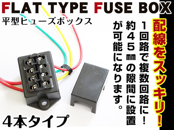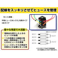 | 【商品詳細】 ・仕様:適合ヒューズ:平型(ブレード)ヒューズ 取付可能ヒューズ数:4本 配線の太さ:入力側 2sq / 出力側 1.25sq |