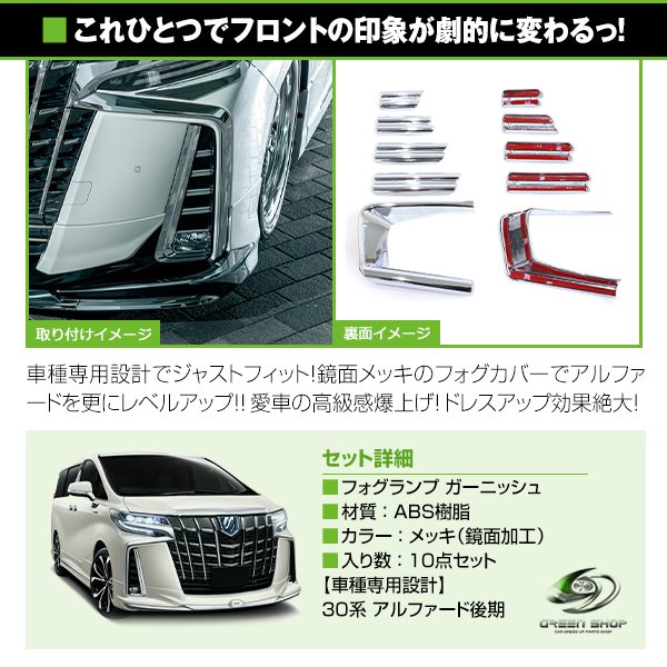 | 【商品説明】 アルファード30系後期エアロボディー専用メッキフォグランプガーニッシュ 鮮やかな鏡面メッキ仕上げで高級感のあるフロントフェイスに! |