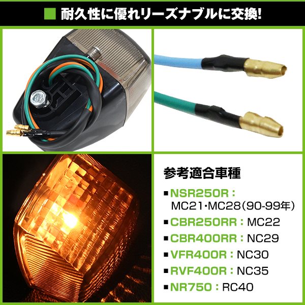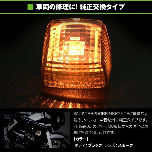 | 【商品説明】 新品 HONDA NSR250R/CBR250RR 純正タイプ スモークウインカー4個セット ホンダ NSR250R CBR250RRタイプのスモークウインカー4個セットです 汎用品のためベースの形状が合えば他の車種にも取り付け可能です 詳しくは写真でご確認下さい |