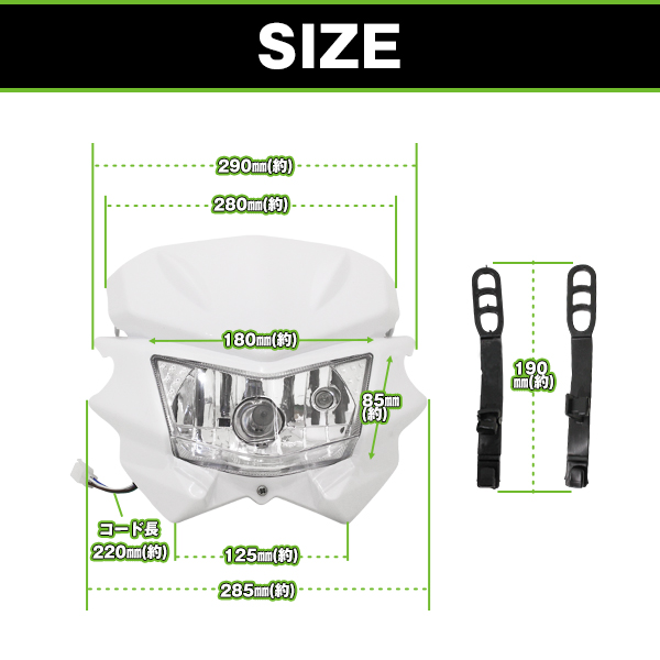 | 【商品詳細】 ・商品仕様:■商品情報 取り付けはフロントフォークにゴムバンド4点止め(調整有)ですので、 ミニバイク正立フォークから大型倒立フォークまで オフロード、モタードだけでなく、ネイキッドバイクやストリートファイターカスタム等に幅広く装着可能です。 【付属品】 ヘッドライトゴムバンド×4 【カラー】 ホワイト 【バルブ】 H4 ※ ミニモト等の一部正立フォークで取り付けバンドが大きすぎる場合はゴム板等をフォークに巻いて使用ください。 |