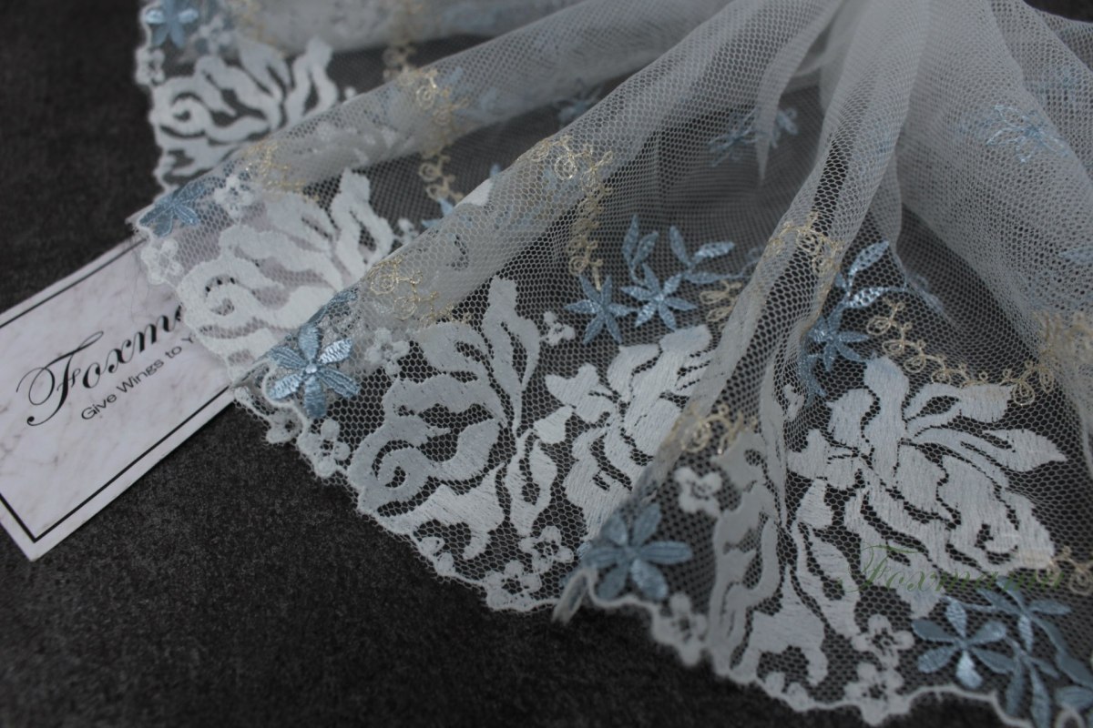 片山チュール刺繍レース 0.5m 花 キナリ x ブルーグレー x ラメ糸 (LFLB02MXSHKY)