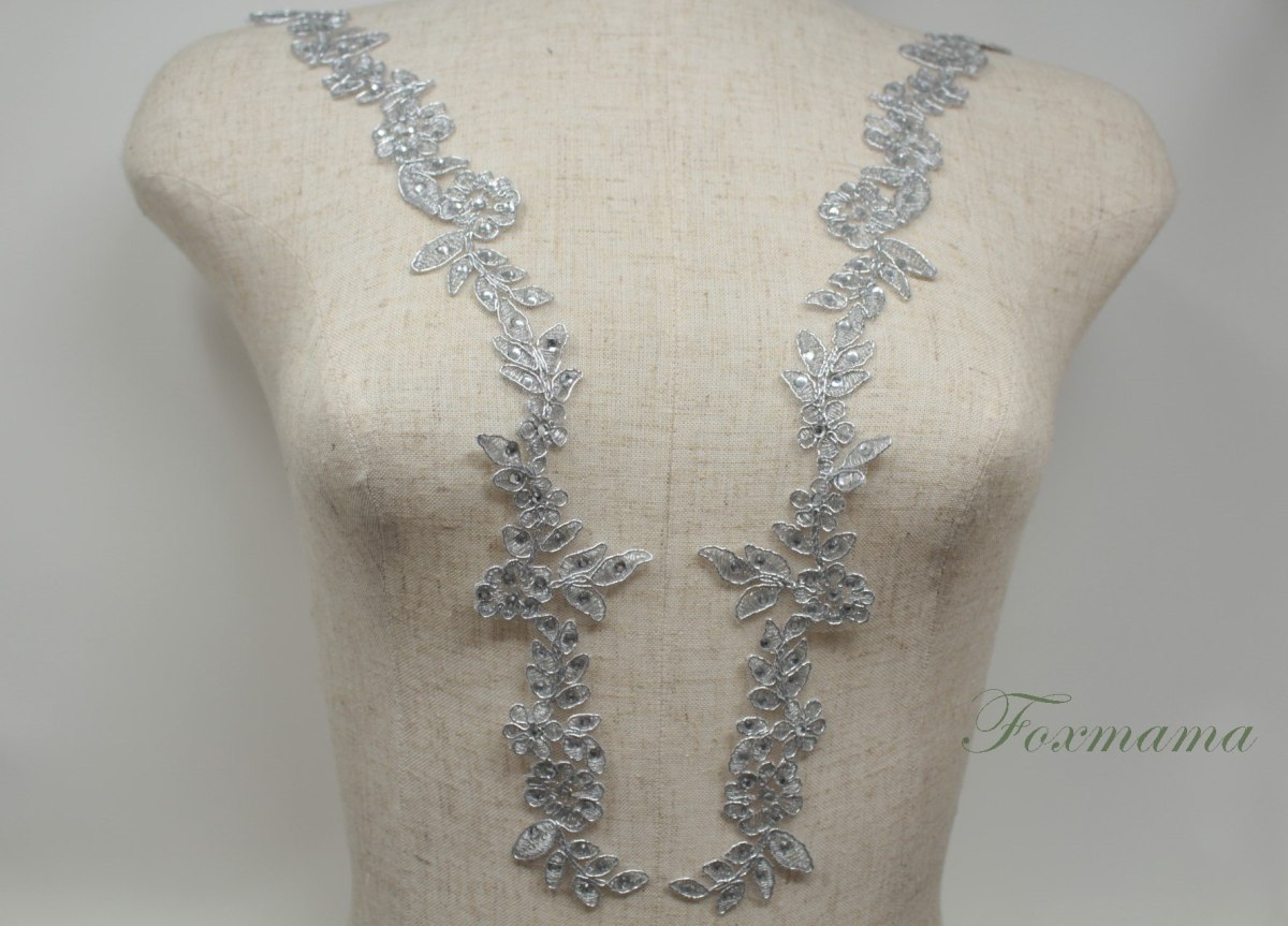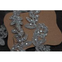 チュールコード刺繍モチーフ 1対 花 シルバーxグレー ラインストーン装飾 (MFLC72SVHWJL)