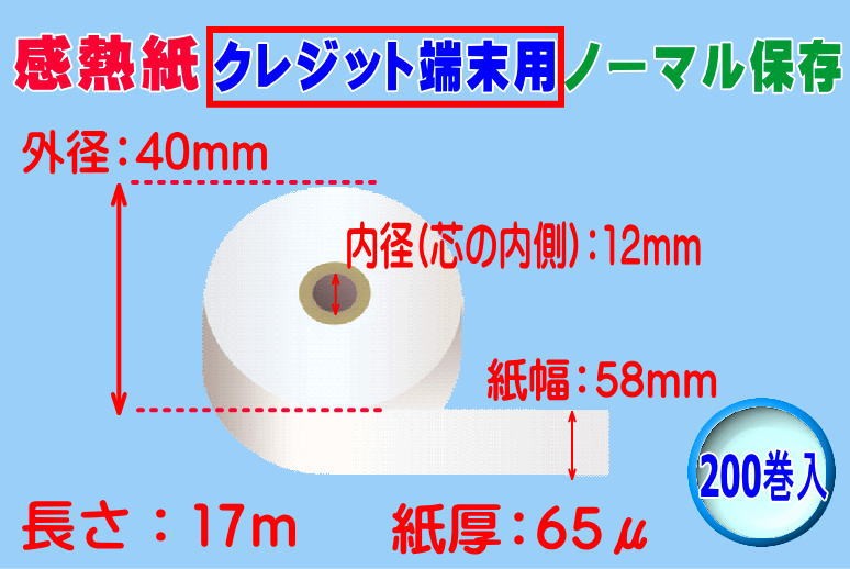 感熱紙 クレジット端末用 ノーマル 紙幅58mm×外径40×内径12(65μ) 200巻入※代引き不可