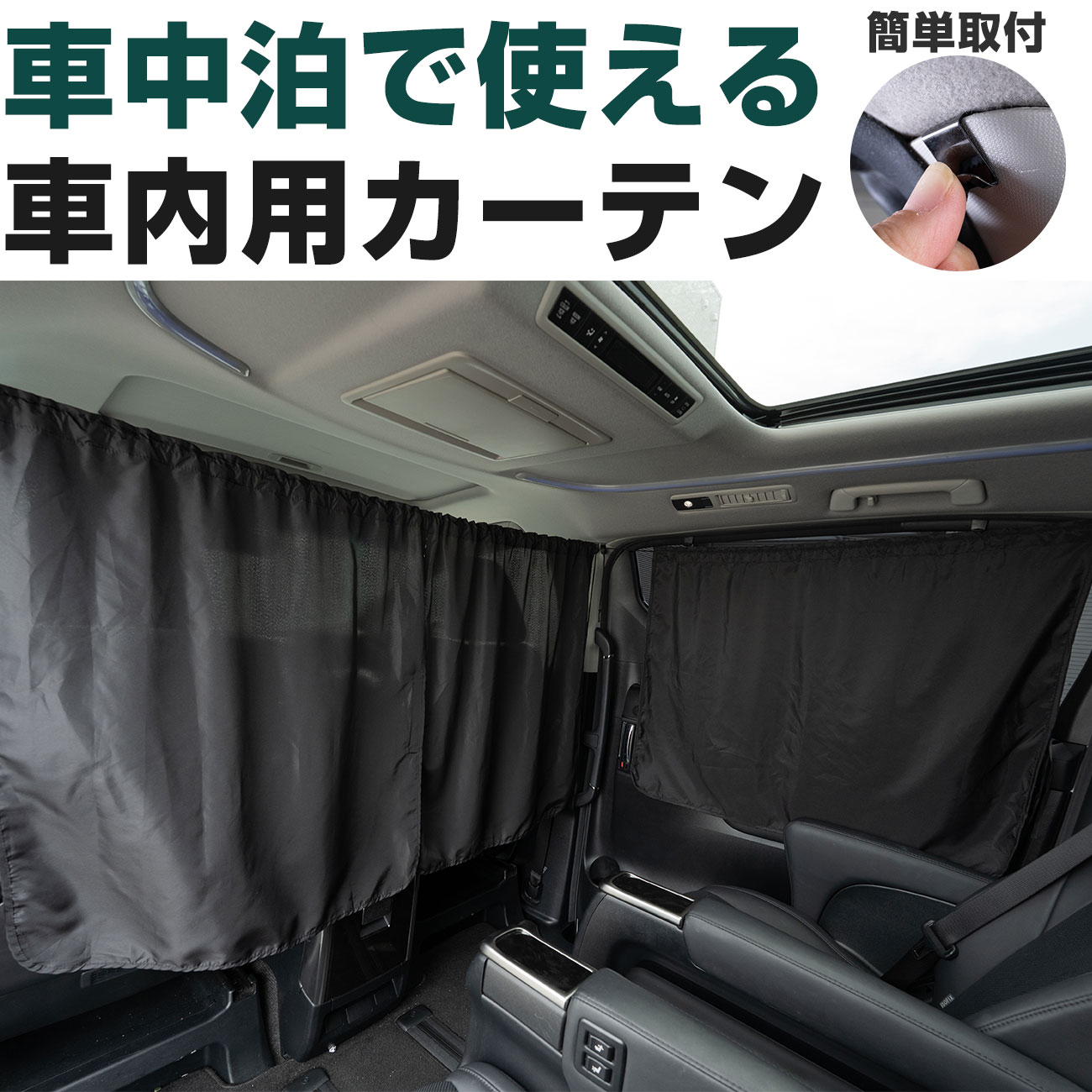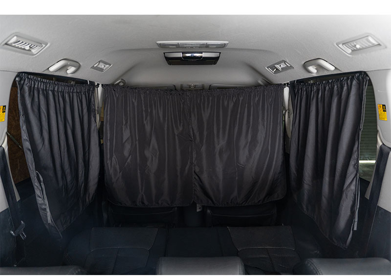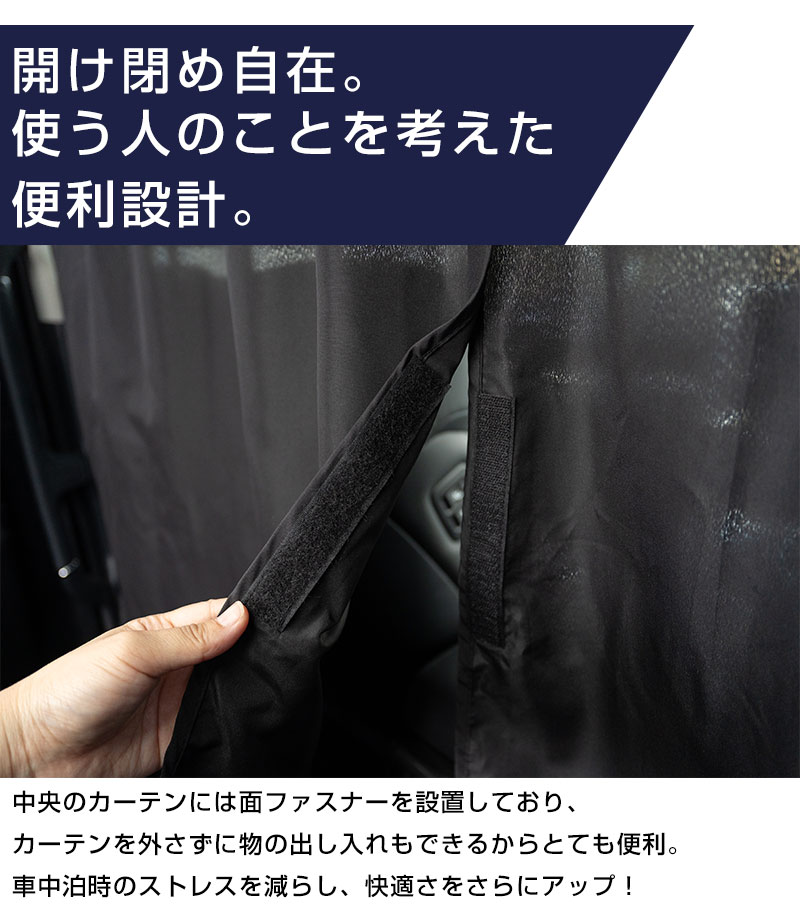 前後左右の窓に合わせて3枚セットで使える紐タイプカーテン。昼間の強い日差しやプライバシーを守ります。