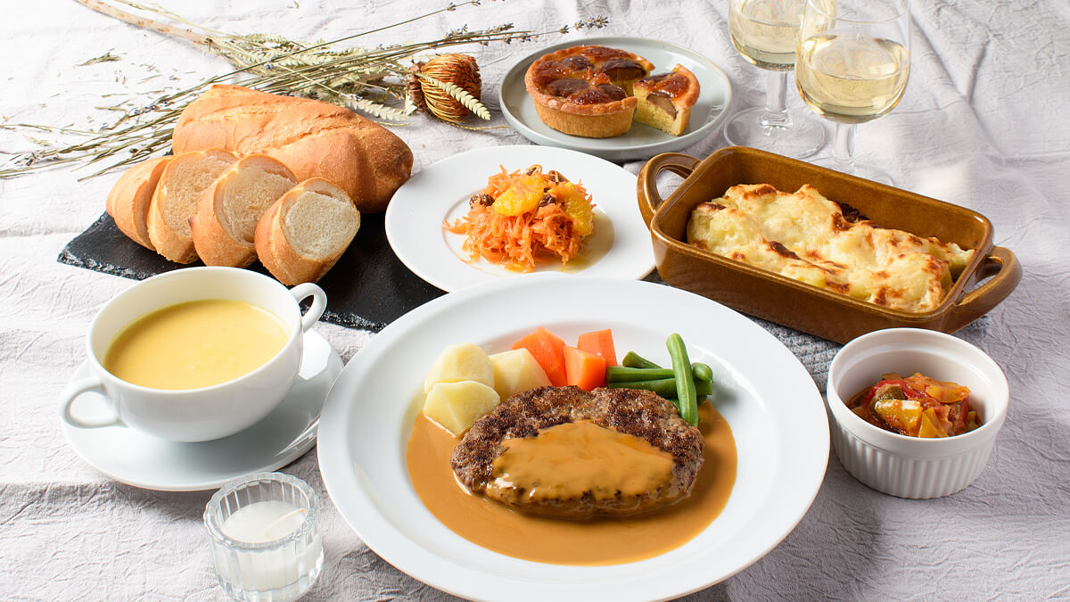 | パンやスープ、ちょっとした前菜を用意すれば、自宅でフルコースが楽しめますよ。 全て揃えたコースセットもご用意しております。料理は時短して、食事の時間をゆっくり過ごしてみてはいかがでしょうか。 | ||