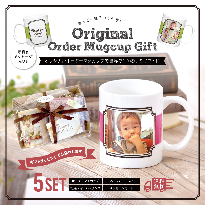 | 世界で1つだけのオリジナルオーダーマグカップを贈ってみませんか? 写真 & メッセージ入り マグカップのデザイン6バリエーション (3デザイン×2色展開)から選べるスペシャルな限定ギフトセット! マグカップの他に紅茶ティーバッグと メッセージカードをペーパートレイに詰めて 可愛いギフトラッピングでお届けします。 |