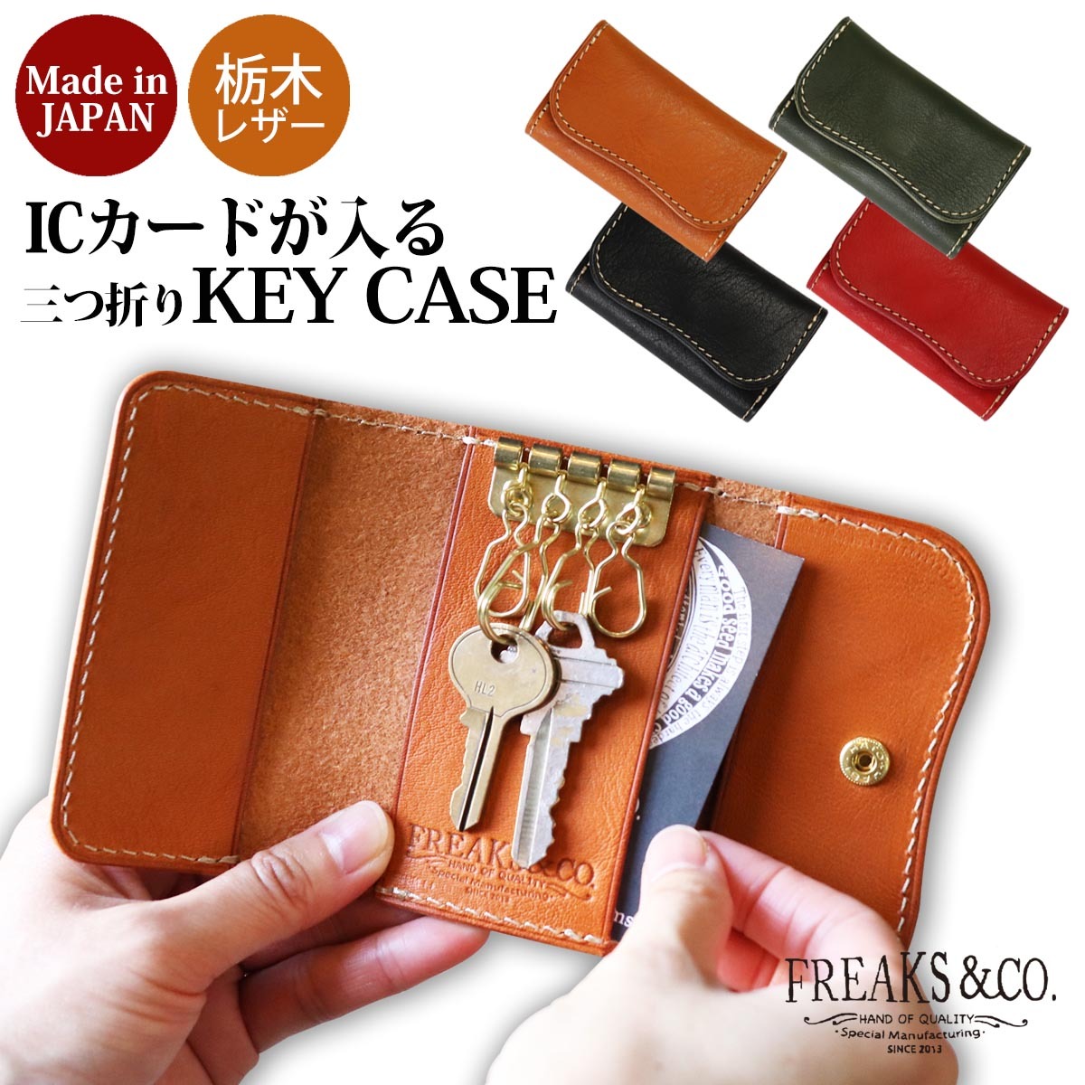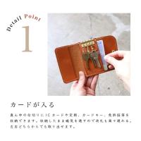日本製4連キーフックのついた三つ折りのレザーキーケースです。真ん中に電子カード(suikaやICOCAなど)や定期等が差し込めるデザインになっています。気軽に使える革小物ですので、女性にはもちろん男性にも似合います。ぜひ日常を彩るひとつに加えて頂きたいです。