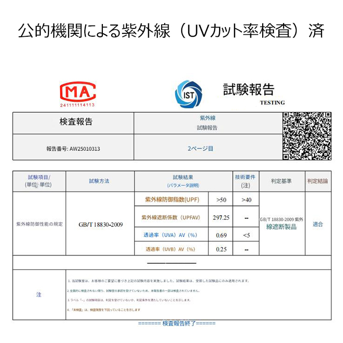 公的機関による紫外線検査(UVカット率検査)済の UPF50+ の商品になります。