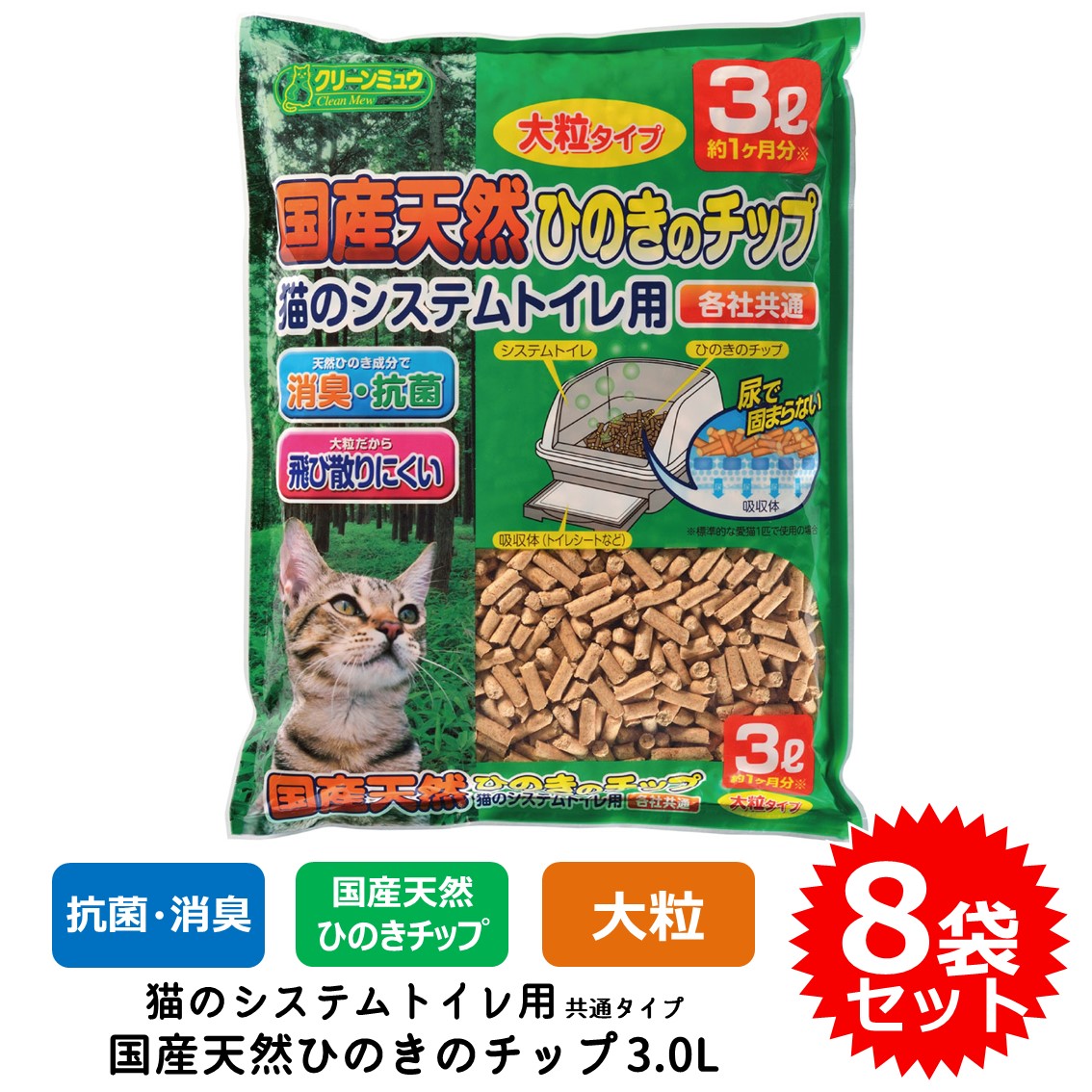 8袋セット 猫砂 ネコ砂 チップ 大粒 クリーンミュウ 木製 システムトイレ用 すのこ付きトイレ用 国産天然ひのきのチップ 3.0L FREEBIRD フリーバード