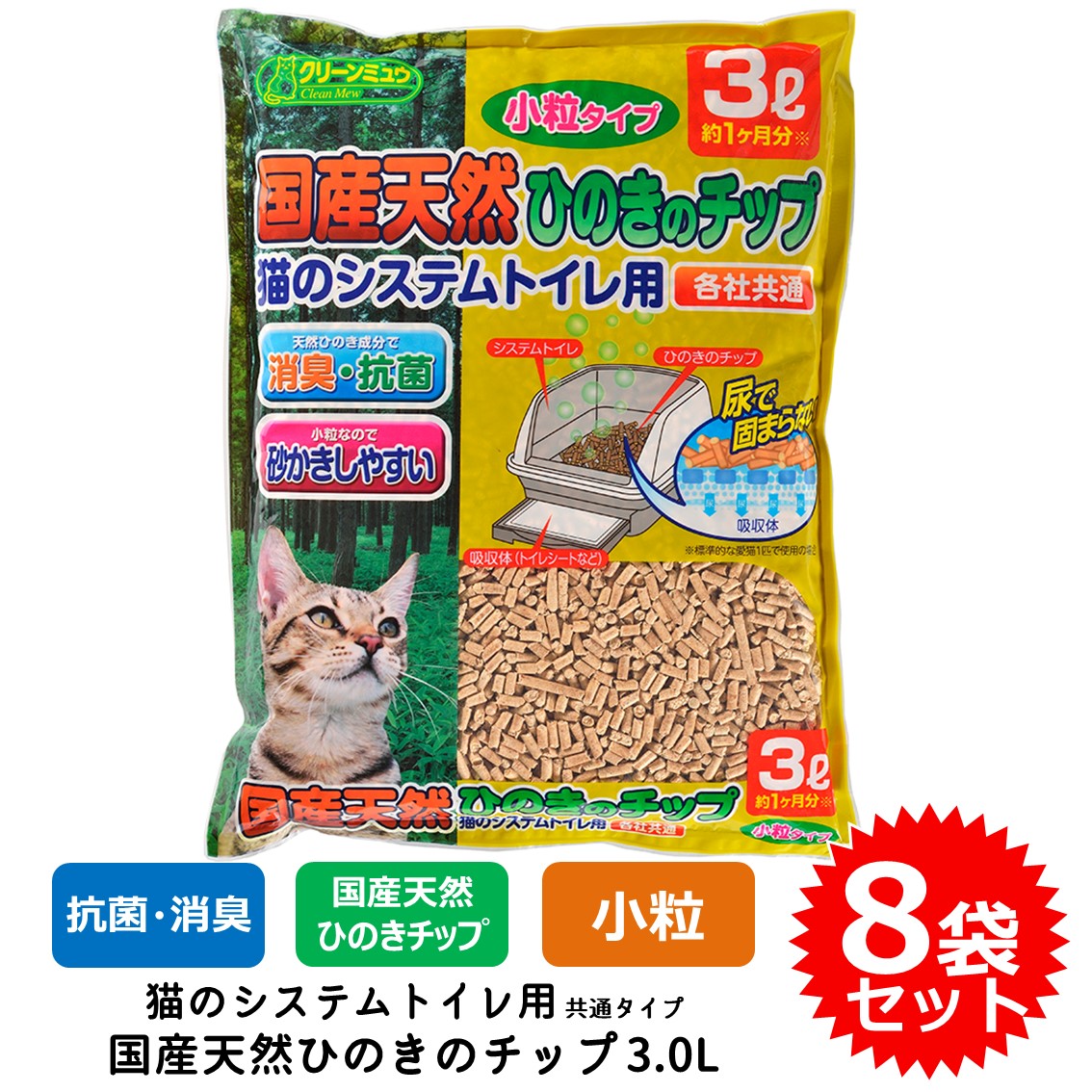 8袋セット 猫砂 ネコ砂 チップ 小粒 クリーンミュウ 木製 システムトイレ用 すのこ付きトイレ用 国産天然ひのきのチップ 3.0L FREE BIRD フリーバード