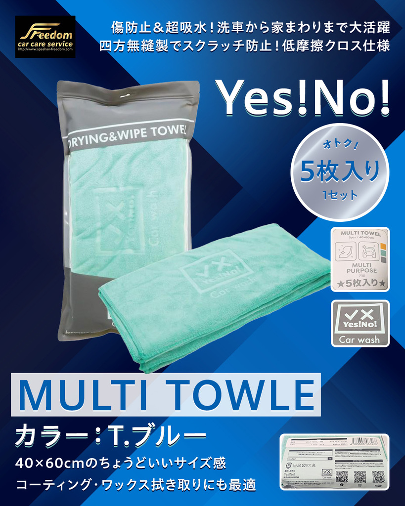 NEW スパシャン Yes!No! 5枚入り 洗車用タオル マルチタオル Tブルー 40×60cm マイクロファイバー 超吸水 洗車 ふき取り 吸水クロス 傷防止