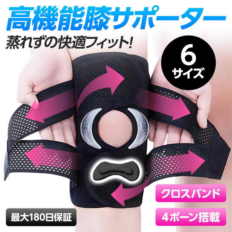 膝の曲げ伸ばしをしっかり支え、動作時の負担を軽減します。スポーツや日常動作を快適にサポート。