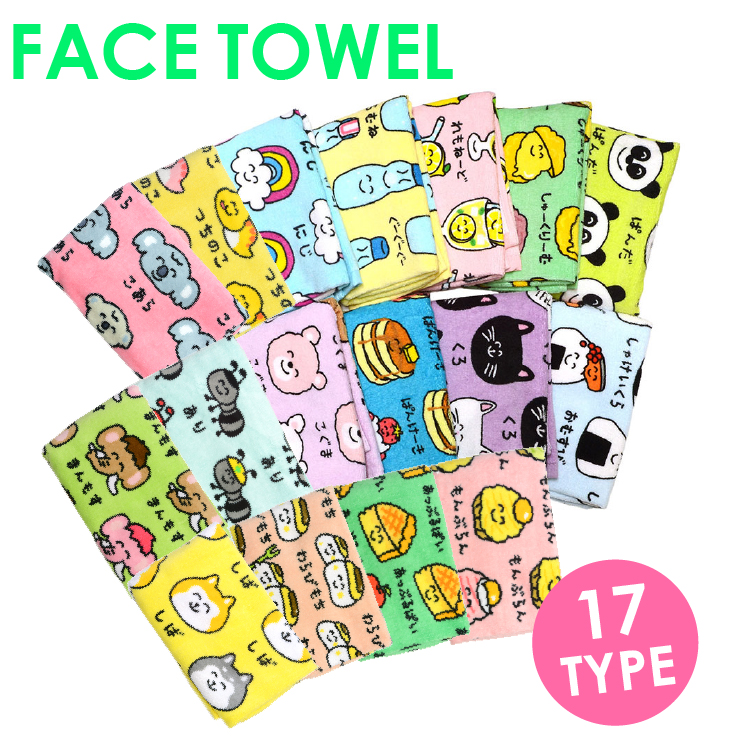 【2枚までメール便280円対応】フェイスタオル プリント 17種類 タオル 34×75cm キャラクター 子供 通園 通学 アニマル クマ ネコ フード スイーツ プレゼント┃