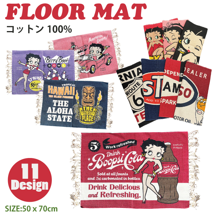 フロアマット-02 アメキャラ 生成リ 11種類 アメリカン ベティ CHAMPION ESSO STP ROUTE66 TIKI 玄関マット フリンジ付き キッチン お風呂 【メール便対応】┃
