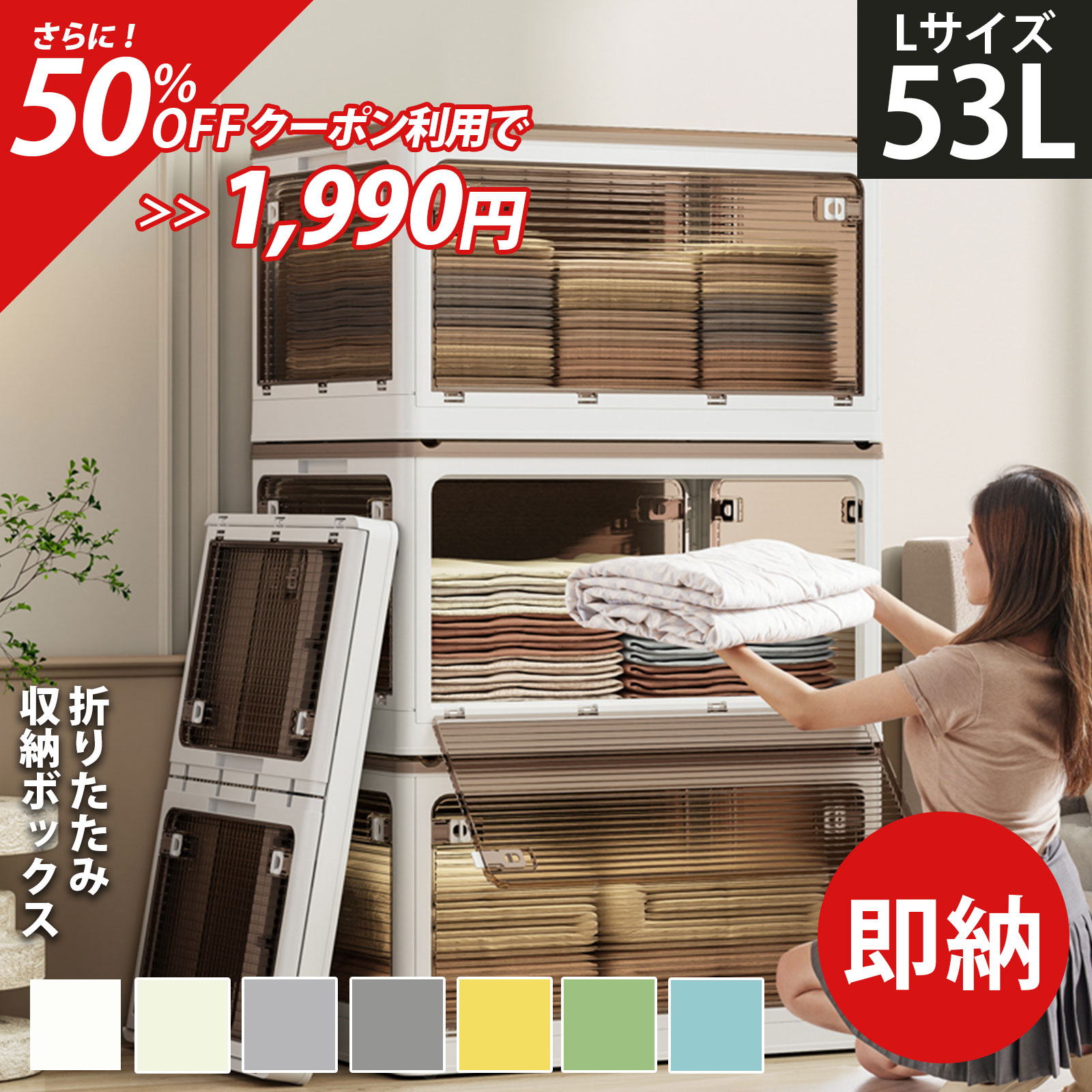 収納ボックス 収納ケース L 53L 折りたたみ 収納 ふた付き キャスター付き 5面開き 白 ホワイト おしゃれ プラスチック 衣装ケース コンテナ ボックス 衣類