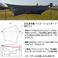 従来の左右非対称タープでは無くアシンメトリにすることで長短をつけ、状況に合わせた使い方ができるようにしたソロタープ
