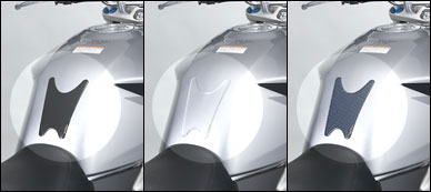 ガソリンタンクの股間部分をフスナーや埃との摩擦によるスクラッチから守るしなやかなパッド。