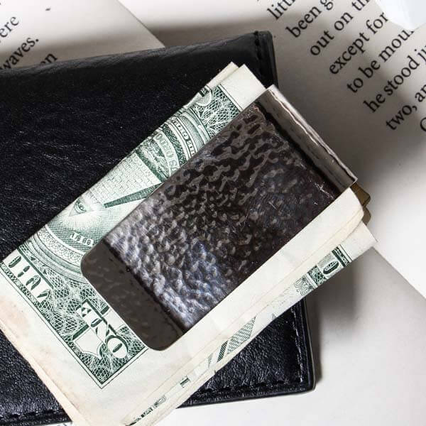 職人が丹念に打ち出し加工を施した、真鍮製マネークリップ。鍛えることで強度を増したマネークリップは、細かい槌目による奥行きある光沢により存在感を際立たせています。