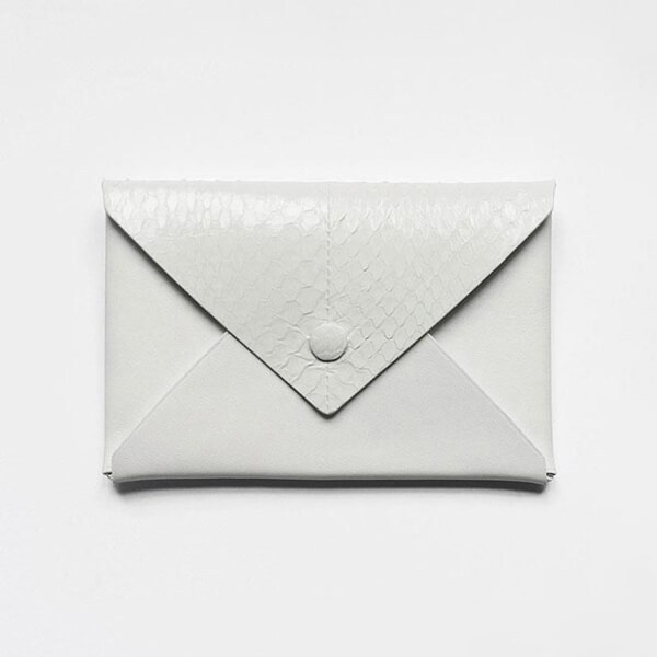 - 蛇革で出来た封筒型のパスポートケースです。チケットや旅行の必需品などを入れて持ち歩けます。蓋はスタッドで固定されております。