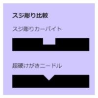 スジ彫り用に開発された精密工具です。非常に硬い超硬合金(タングステンカーバイト)を使用する事で驚きの切れ味と高耐久性を実現しました。刃先はエッジの効いた平刀型で、均一な幅のスジ彫りを行う事ができます。深彫りしても線の太さは変わりません。刃先が鋭角なので図(1)の様に角からスジ彫りが可能です。刃の幅は12種類。各サイズごとに色分けしたリングを装着。斬技ホルダーあるいはピンバイス等に装着して使用します。【使用上のご注意】スジ彫りカーバイトの材質は非常に硬い超硬合金です。硬度が高い代わりに粘りが無い為、ねじったり、弾いたり、横からの力が掛かったりした場合に折れる事があります。曲線のスジ彫りや0.1〜0.2mmの細いスジ彫りカーバイトの使用時には特にご注意ください。