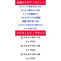 実寸:ウエスト102から112cm、股上31.5cm、股下45cm、わたり38.5cm、裾幅26.5cm、ヒップ127cm
