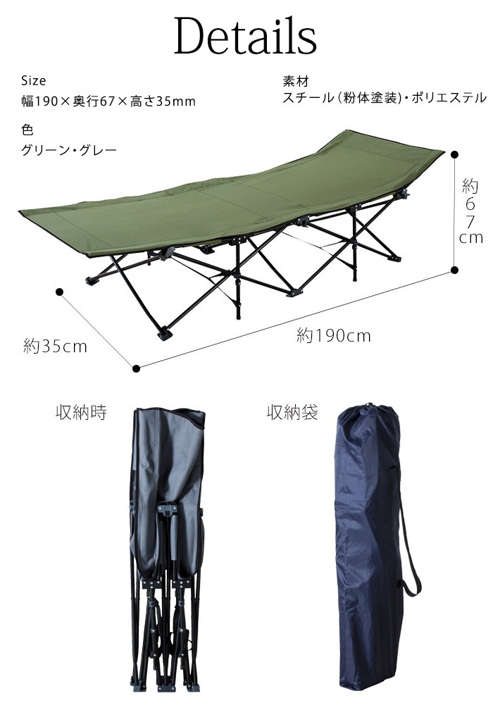 キャンプや野外フェス、ツーリングをはじめ、近年話題のアウトドアリビングに大活躍の折りたたみ式簡易ベッドです。